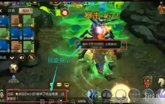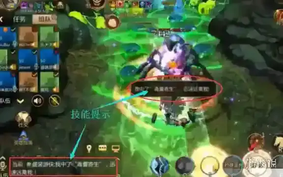 传送技能会在屏幕上方提示一排字体(泰斯提将多名英雄传送进了洞窟,并准备孵化幼蛛)