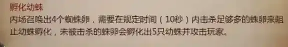 孵化蜘蛛这个技能就是上面看到的内场四个地上的蜘蛛蛋。这个技能可以忽略,知道这个技能在什么地方,技能机制什么样就行。