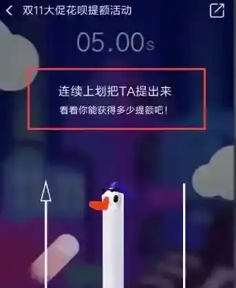 4,这个游戏的游戏规则就是用力把这个戴着帽子的小鹅给提出来,成功的话就能获得一定的花呗额度,当然这个有几率,也会有不成功的时候哦,共有10次提额机会,每轮有5秒的时间。