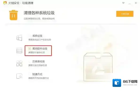 3.在垃圾清理功能中,勾选常用软件垃圾选项,并点击开始扫描。