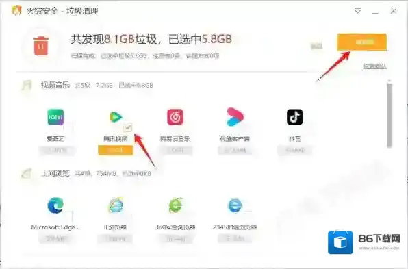 4.在扫描结果中,勾选腾讯视频,并点击一键清理按钮。