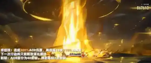 强化普攻:造成150%倍率的AOE伤害,如果敌方只有2个目标则变为300%倍率,1个目标则为370%倍率,获得1层魔力放出效果,恢复1个战技点和30能量