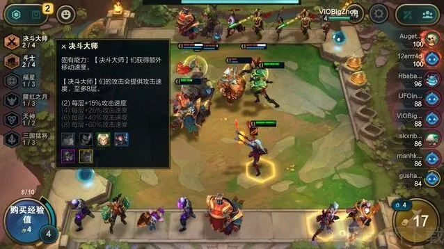 决斗大师的羁绊是这个阵容中最重要的羁绊之一。这个阵容的核心是围绕决斗大师进行布局和运营。然而更奇妙的是,云顶的游戏只有六个英雄。不过难度可以通过操作八个决斗大师来理解,但是八个决斗大师带来的攻击速度加成也是超越其他阵容的,这既是这个阵容的优势也是劣势。