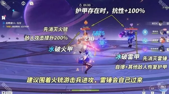 击杀顺序不同效果不同,先消灭火铳游击兵则队友攻击提升200%,先消灭雷锤前锋军则刷新队友护甲并产生范围爆炸。从麻烦程度来看,优先处理火铳游击兵更佳,可以少破点儿护甲。