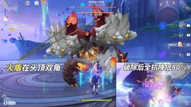 头顶双角存在时火抗140%,其他抗性90%,需使用水元素伤害攻击其头顶双角破除后全抗降低80%,大幅提升造成的伤害。