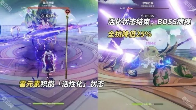 尽量使用雷元素角色,通过雷伤积攒其血条旁「活性化」状态进度。活化状态翠翎恐蕈会施放勐烈攻击,随后瘫倒在地,全抗降低为0%(常态25%全抗)
