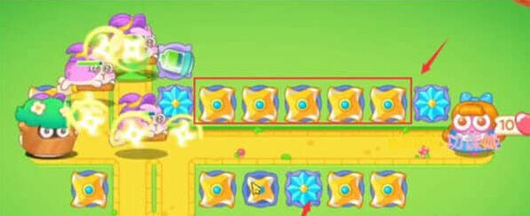 3、将右侧道路上方的飞镖升到满级,它们可以对左边过来的兔子造成可观伤害,之后在拐角处建造一个雪花塔冻结敌人。