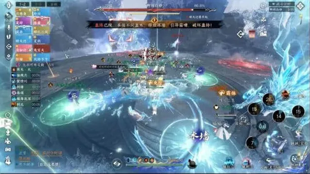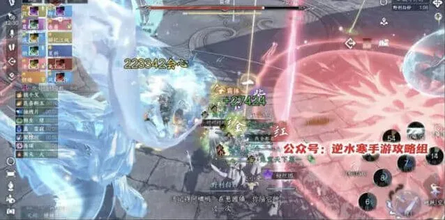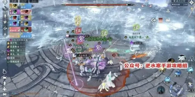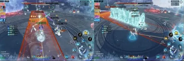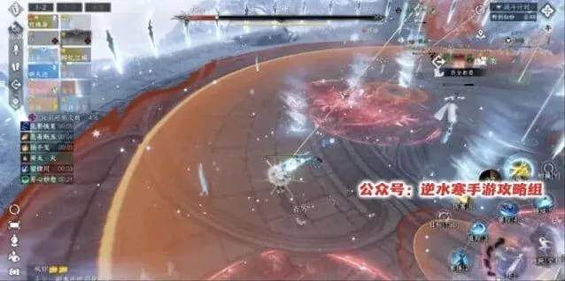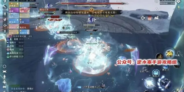 8、流程5:第二个组合技,所有人红圈+雪寂+相生蛊+野利白妙和分身AOE攻击。安全区的位置就在我们前面拉冰墙的两端,我们这里标点是3和4,走位就是3→4→3