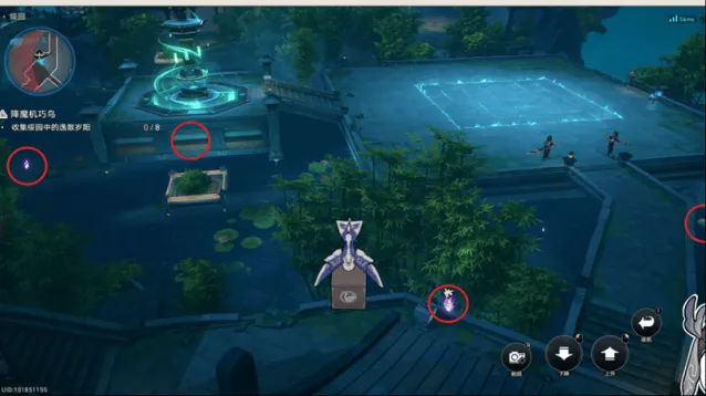 (2)之后顺着楼梯飞下去,假山附近有四个
