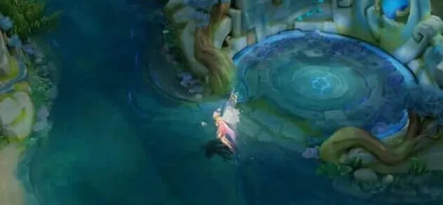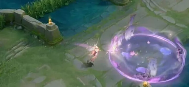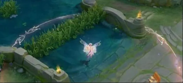 ⑦回城特效:水面波光粼粼,她轻轻触碰飞入的灵蝶,思念化成丝线在刹那展开化作茧床;她躺在茧床内与灵蝶互动,灵蝶带走思绪,茧床消散,她追逐灵蝶而去。