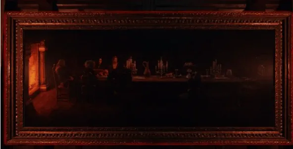 step12.进入到屋内的餐厅,先调查壁画,发现壁炉和画中从左至右的两盏蜡烛都被点燃。