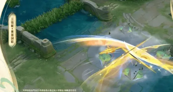 1、一技能:化作金芒向前突进,金色能量汇聚而成的分身于原地潇洒舞剑。