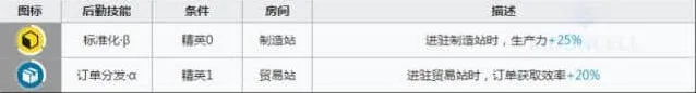 自然,我们的香草依然是继承了广大低星干员的光荣传统,战斗不行基建强。香草的基建技能也是顶级。1技能的25%制造站效率就不用我说了吧,2技能虽然订单效率是略低了点,但是也不是完全不能用。
