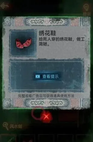 10、打开大门后我们进去在墙上获得风水剑,回棺材那,用风水剑剪开红绳即可获得绣花鞋。