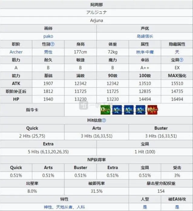 那么首先从面板来看的话,阿周那突出的地方在于极高的基础atk面板,在弓阶内部仅仅低于冠位弓阶超人俄里翁,比闪闪和弓凛都要高,这么优秀的白值为阿周那打下了好基础,但是可惜的是阿周那配卡尴尬,三蓝卡配红宝具,其实不是特别好用,而且阿周那的np率一般,蓝卡还算是三蓝弓阶从者的平均线水平,谈不上出色,但是绿卡就非常差了,2hit的绿卡,3hit的蓝卡,让阿周那的绿卡无论是打暴击星还是打np都非常差,即使是加上1技能的出星率,绿卡也打不出什么暴击星,可以说阿周那的绿卡性能基本是全从者垫底水平,所幸配卡里也就只有一张绿卡就是了。