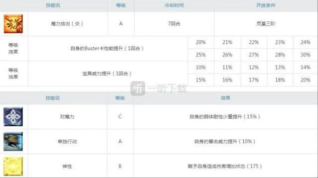 接下来是阿周那的3技能,复合型的魔放,30红魔放和20点宝具威力,在乘算的情况下是1.3×1.2,也即1.56,增幅要略微高过普通的魔放技能,可以说3技能是阿周那3个技能中唯一一个对自身而言没有什么毛病的技能,因为直接影响宝具伤害,推荐大家优先点满吧。