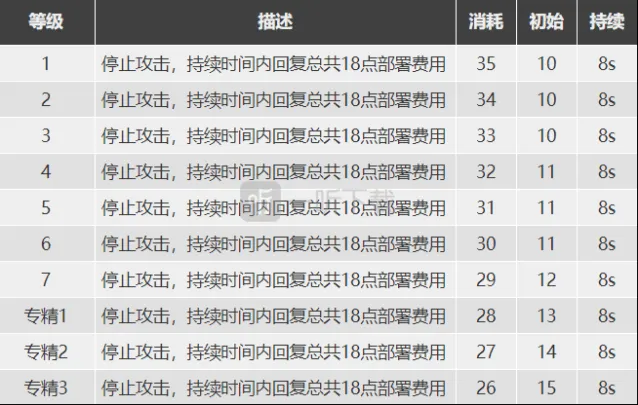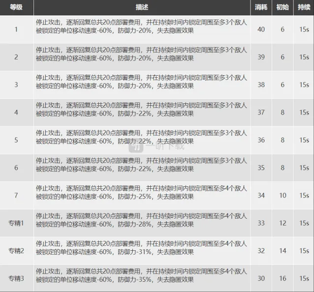 核心技能。极境的二技能通过牺牲回复费用的效率换来了减速、破隐和减防的组合效果,这样的设计使得携带二技能的极境在做好本职任务的同时还可以一定程度上的起到辅助的效果。但是二技能的最大捕捉数为四人,也就是说最多仅能干涉到四名敌人。并且由于二技能回费效果没有一技能突出,携带二技能在前期就不可避免的需要在反隐和回费之间做出选择。此外,由于该技能带来的减防效果是百分比减防,因此基本所有物理输出干员都能够从这个buff中获利。