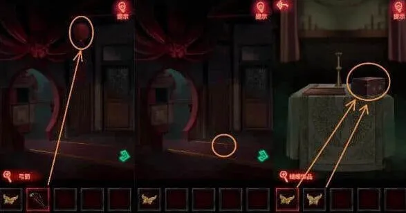 14、弓箭对气球上的蝴蝶饰品使用,拿到蝴蝶饰品后,用它来打开拜堂桌上的盒子,获得手镯。