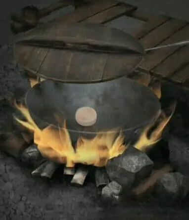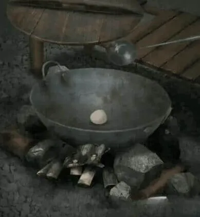 21、香炉盛水,将水和生豆饼放入锅子里,盖上盖子,获得浆糊熟豆饼。