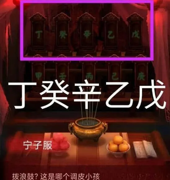 3、我们根据墓碑线索和书本提示排列灵位,得到顺序答案:丁、癸、辛、乙、戊。