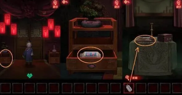 12、来到老人门口,用手机观看女人敲门的步骤,开门获得火柴,在老人灵棚内点燃火柴,开启柜子。