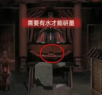 7、空香炉对水缸使用,获得水,再回到城隍庙,点击桌子,点击香炉,点击砚台,用墨块研墨。