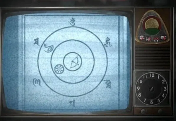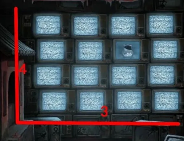 全部进对后就能离开这个空间回到沙漠了,再次进入佛像下面的监控室,查看一下商标红笔标注是 3^4,那么是不是可以理解为向右3格,向上4格呢,既然是向右向上,那么起始点肯定是从左下角了,从左下角的显示器向右3格向上4格后找到的是第一排的第3个,查看一下这个电视使用商标后果然出现图案。