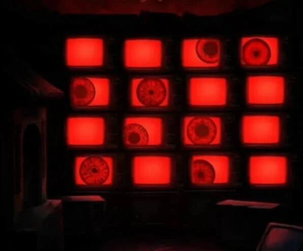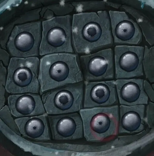 小高能过后电视上的眼睛是有两种形态的,大瞳孔和小瞳孔,眼睛位置也是会变化的,这里就把两张图合在一起吧,大概就是第一行3大4小,第二行1大2小,第三行2大3大,第四行1小3小,记好后就可以后退一下来到冰雪世界,查看右边墙上的机关开始调整了。