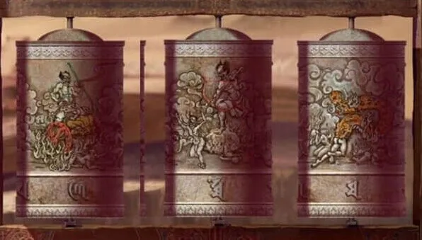 这个图案看起来也有些眼熟,后退一下来到沙漠,查看中间旋转圆筒,记下来车轮、弓箭、龙对应的符号,这里其实不确定那是龙还是蛇,好像是一条大蟒蛇,这不重要,如果难判断最后一个对应符号是这一个还是继续转的那一个,我们可以都记下来穷举一下就行了~遇到谜题有歧义最好的办法就是穷举法。