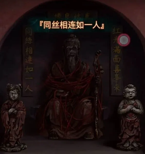 回到冰雪世界,将铁杯子交给八不郎获得女童子像,回到监控室查看左边的月老像,将两个童子像放在左右两边就能玩个小游戏,在蜘蛛头变大的时候点一下就行,主要是考手速难度不大,完成之后拿到一根红绳,不是说同丝相连如一人么,所以一个名额就能出去两个人了,玩的一手好消消乐。