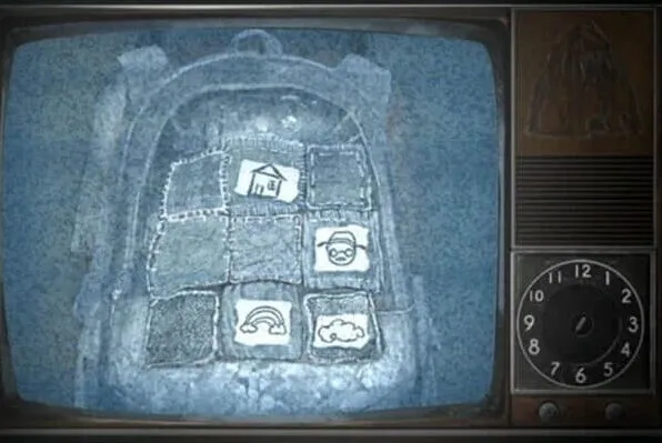 然后就可以进入佛像下面的门了,进门后发现只有一台显示器亮着,查看一下上面的图案很眼熟,按住图案是可以拖动的,拖动图案换一下位置到书页上的位置,电视画面开始变化,等停止变化时从电视里上的书包里拿到洋娃娃和第二个圆球。