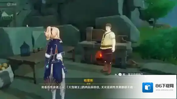 获取足够食材后返回去寻找哈里斯进行对话,这时哈里斯又提出还需要一份「大雪猪王的肉」。按照攻略进行的小伙伴们这时只需要掏出刚才击杀大雪猪王获得的「大雪猪王的肉」就好啦,没有的小伙伴可以按阶段一所示位置,去击杀一只大雪猪王再回来即可。