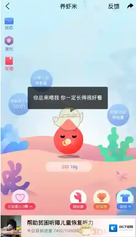现在可以开始喂养虾米Baby了,首先点击下图红色箭头所指的可收获的能量球(听音乐是可以获得能量球的)。
