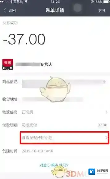 5、账单详情页面点击更多会显示支付宝交易号、商家交易号注: 使用花呗支付的交易会显示查看花呗使用明细,点击跳转到花呗额度明细页面