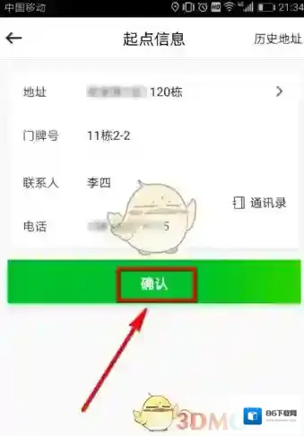 4、此时页面自动跳转至“终点信息”页面,根据页面提示输入地址、门牌号、联系人以及电话号码等信息,输入完成后点击页面的确认按钮。