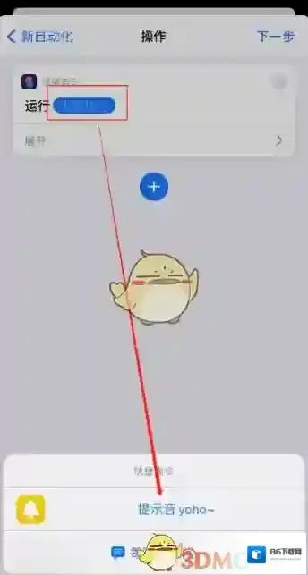 8、选择运行快捷指令,再次点击快捷指令,选择提示音,点击下一步