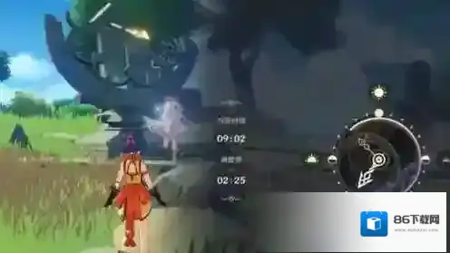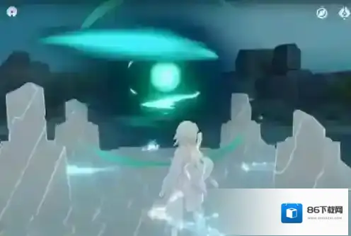 3、把时间调整到晚上2-5点之间,爬到日晷上去,开启元素视野发现一个黑球,用风属性去攻击它。
