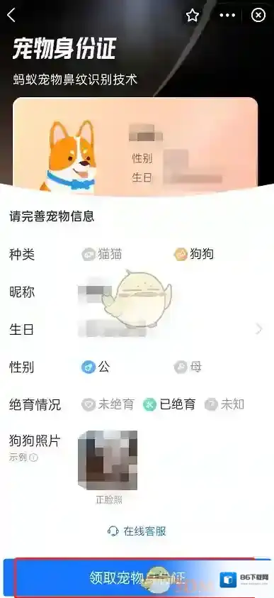 4、在这里填写宠物的信息,并上传正脸照,完成后点击领取宠物身份证。