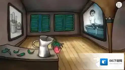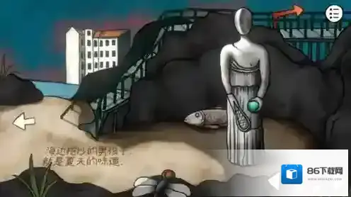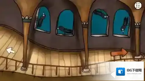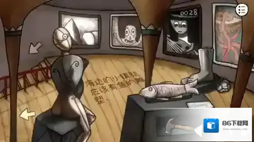 把鱼雕像,放在展柜上,得到锤子,先左走