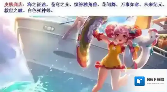 皮肤碎片商店上架了史诗皮肤缤纷独角兽、2888点券皮肤苍穹之光、良心皮肤花间舞、新皮肤海之征途等,花间舞这款皮肤很不错,技能拥有颜色特效。