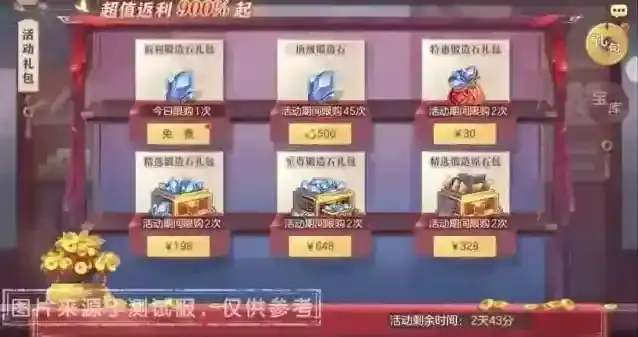 至尊锻造石礼包:含顶级锻造石*45,元宝*6480,售价648元,活动期间限购2次