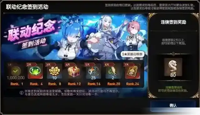 欧勒毕斯将真诚的欢迎送达至冒险者们的手中,联动纪念签到活动将同步上线。签到活动期间内,符合角色等级的继承者可得到对应登录日期的签到礼物。礼物将涵盖“5星英雄召唤券(可随机召唤1名5星英雄)”、“魔罗戈拉”、“誓约书签”、“一捆催化剂箱”、“上级精灵之花”、“潜能开发碎片”等。完成连续签到还将得到行动力奖励,为有趣的冒险送上满满能量。