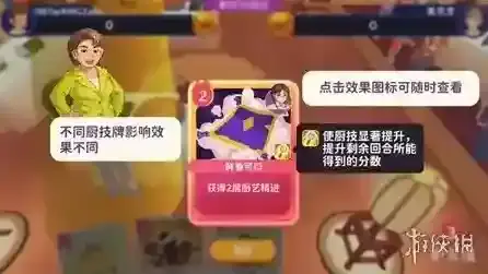 首先,要了解这些厨技牌的规则,可点击右下角图标查看,厨技牌大致分为己方分数增加对手分数减少正 buff负 buff这四种类型,简单概括就是加、减、乘、除的效果。