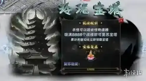 杀怪可以吸收怪物魂魄吸满8888个魂魄即可复苏宝塔,累计充值10元立即领取宝塔。