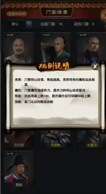 2、每个门客都是拥有自己擅长的领域,并且所有的门客属性都是进行叠加的。拥有的门客数量越多并且等级越高玩家的实力也会越高!