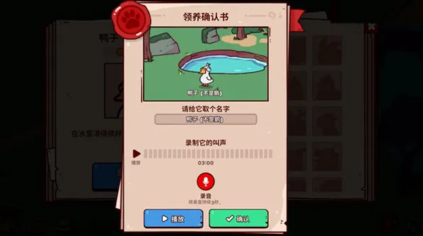 答:领养动物后可在对应界面开启录音功能,录制专属声音并绑定到该动物身上,打造独一无二的互动效果。