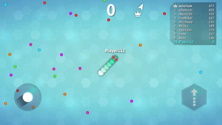 2、要注意自己的蛇头碰到其他贪吃蛇的身体就会死亡喔,并且会产生大量小圆点。
