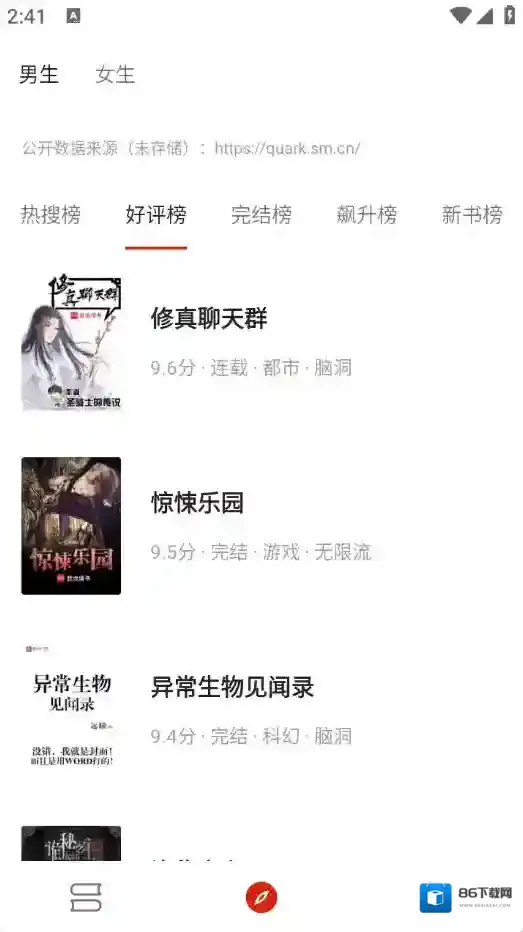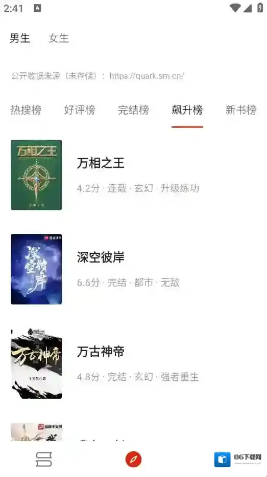 2、进入小说页面,有很多的小说资源,热搜榜、完结榜以及飙升榜等都有。