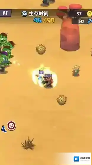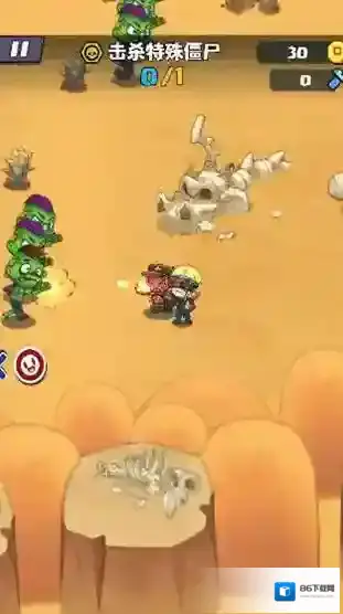 2、遇僵尸(绿色)时,瞄准射击(红箭头方向),优先清除挡路敌人。