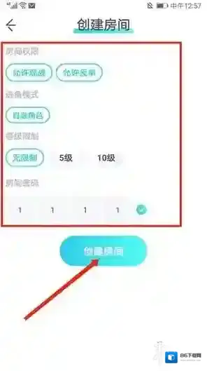 2、跳转至房间配置页面,完成访问权限、角色分配、玩家等级及密码保护四项设置后,确认底部创建操作。